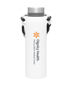 32 oz double wall 18/8 stainless steel thermal bottle with copper vacuum insulation, insulated stainless steel threaded lid, silicone ring, removable strap with buckles, removable clasps, and powder coated finish. Individual gift box. Hand wash recommended. Do not microwave. Complies with FDA, Prop 65. 11" H x 3.1875" W