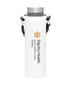 32 oz double wall 18/8 stainless steel thermal bottle with copper vacuum insulation, insulated stainless steel threaded lid, silicone ring, removable strap with buckles, removable clasps, and powder coated finish. Individual gift box. Hand wash recommended. Do not microwave. Complies with FDA, Prop 65. 11" H x 3.1875" W