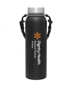 32 oz double wall 18/8 stainless steel thermal bottle with copper vacuum insulation, insulated stainless steel threaded lid, silicone ring, removable strap with buckles, removable clasps, and powder coated finish. Individual gift box. Hand wash recommended. Do not microwave. Complies with FDA, Prop 65. 11" H x 3.1875" W
