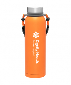 32 oz double wall 18/8 stainless steel thermal bottle with copper vacuum insulation, insulated stainless steel threaded lid, silicone ring, removable strap with buckles, removable clasps, and powder coated finish. Individual gift box. Hand wash recommended. Do not microwave. Complies with FDA, Prop 65. 11" H x 3.1875" W