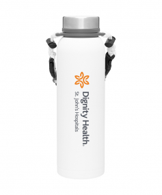 32 oz double wall 18/8 stainless steel thermal bottle with copper vacuum insulation, insulated stainless steel threaded lid, silicone ring, removable strap with buckles, removable clasps, and powder coated finish. Individual gift box. Hand wash recommended. Do not microwave. Complies with FDA, Prop 65. 11" H x 3.1875" W