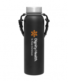 32 oz double wall 18/8 stainless steel thermal bottle with copper vacuum insulation, insulated stainless steel threaded lid, silicone ring, removable strap with buckles, removable clasps, and powder coated finish. Individual gift box. Hand wash recommended. Do not microwave. Complies with FDA, Prop 65. 11" H x 3.1875" W