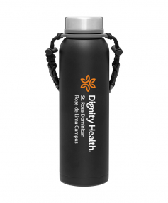 32 oz double wall 18/8 stainless steel thermal bottle with copper vacuum insulation, insulated stainless steel threaded lid, silicone ring, removable strap with buckles, removable clasps, and powder coated finish. Individual gift box. Hand wash recommended. Do not microwave. Complies with FDA, Prop 65. 11" H x 3.1875" W