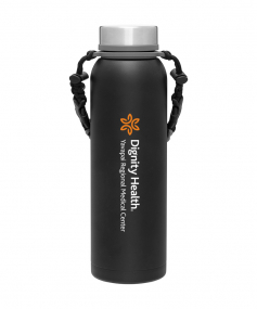 32 oz double wall 18/8 stainless steel thermal bottle with copper vacuum insulation, insulated stainless steel threaded lid, silicone ring, removable strap with buckles, removable clasps, and powder coated finish. Individual gift box. Hand wash recommended. Do not microwave. Complies with FDA, Prop 65. 11" H x 3.1875" W