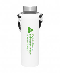 32 oz double wall 18/8 stainless steel thermal bottle with copper vacuum insulation, insulated stainless steel threaded lid, silicone ring, removable strap with buckles, removable clasps, and powder coated finish. Individual gift box. Hand wash recommended. Do not microwave. Complies with FDA, Prop 65. 11" H x 3.1875" W