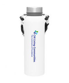 32 oz double wall 18/8 stainless steel thermal bottle with copper vacuum insulation, insulated stainless steel threaded lid, silicone ring, removable strap with buckles, removable clasps, and powder coated finish. Individual gift box. Hand wash recommended. Do not microwave. Complies with FDA, Prop 65. 11" H x 3.1875" W