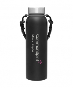 32 oz double wall 18/8 stainless steel thermal bottle with copper vacuum insulation, insulated stainless steel threaded lid, silicone ring, removable strap with buckles, removable clasps, and powder coated finish. Individual gift box. Hand wash recommended. Do not microwave. Complies with FDA, Prop 65. 11" H x 3.1875" W