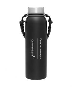 32 oz double wall 18/8 stainless steel thermal bottle with copper vacuum insulation, insulated stainless steel threaded lid, silicone ring, removable strap with buckles, removable clasps, and powder coated finish. Individual gift box. Hand wash recommended. Do not microwave. Complies with FDA, Prop 65. 11" H x 3.1875" W