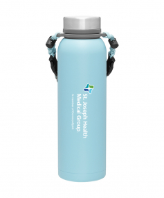 32 oz double wall 18/8 stainless steel thermal bottle with copper vacuum insulation, insulated stainless steel threaded lid, silicone ring, removable strap with buckles, removable clasps, and powder coated finish. Individual gift box. Hand wash recommended. Do not microwave. Complies with FDA, Prop 65. 11" H x 3.1875" W