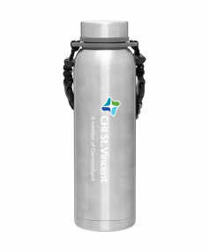 32 oz double wall 18/8 stainless steel thermal bottle with copper vacuum insulation, insulated stainless steel threaded lid, silicone ring, removable strap with buckles, removable clasps, and powder coated finish. Individual gift box. Hand wash recommended. Do not microwave. Complies with FDA, Prop 65. 11" H x 3.1875" W