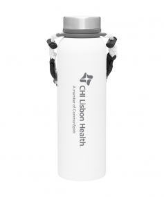 32 oz double wall 18/8 stainless steel thermal bottle with copper vacuum insulation, insulated stainless steel threaded lid, silicone ring, removable strap with buckles, removable clasps, and powder coated finish. Individual gift box. Hand wash recommended. Do not microwave. Complies with FDA, Prop 65. 11" H x 3.1875" W