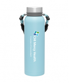32 oz double wall 18/8 stainless steel thermal bottle with copper vacuum insulation, insulated stainless steel threaded lid, silicone ring, removable strap with buckles, removable clasps, and powder coated finish. Individual gift box. Hand wash recommended. Do not microwave. Complies with FDA, Prop 65. 11" H x 3.1875" W