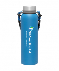 32 oz double wall 18/8 stainless steel thermal bottle with copper vacuum insulation, insulated stainless steel threaded lid, silicone ring, removable strap with buckles, removable clasps, and powder coated finish. Individual gift box. Hand wash recommended. Do not microwave. Complies with FDA, Prop 65. 11" H x 3.1875" W