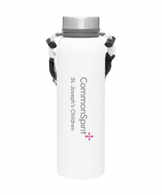 32 oz double wall 18/8 stainless steel thermal bottle with copper vacuum insulation, insulated stainless steel threaded lid, silicone ring, removable strap with buckles, removable clasps, and powder coated finish. Individual gift box. Hand wash recommended. Do not microwave. Complies with FDA, Prop 65. 11" H x 3.1875" W
