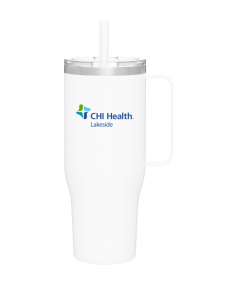 40 oz double wall 18/8 stainless steel thermal mug with copper vacuum insulation, stainless steel rim, dual-purpose push-on clear lid, matching sliding closure, flexible wide silicone straw, and powder coated finish. Individual gift box. Hand wash recommended. Do not microwave. Complies with FDA, Prop 65. 9.75" H x 4" W