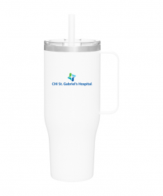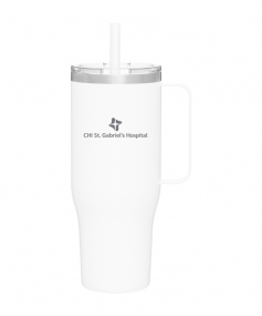 40 oz double wall 18/8 stainless steel thermal mug with copper vacuum insulation, stainless steel rim, dual-purpose push-on clear lid, matching sliding closure, flexible wide silicone straw, and powder coated finish. Individual gift box. Hand wash recommended. Do not microwave. Complies with FDA, Prop 65. 9.75" H x 4" W