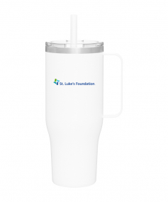 40 oz double wall 18/8 stainless steel thermal mug with copper vacuum insulation, stainless steel rim, dual-purpose push-on clear lid, matching sliding closure, flexible wide silicone straw, and powder coated finish. Individual gift box. Hand wash recommended. Do not microwave. Complies with FDA, Prop 65. 9.75" H x 4" W
