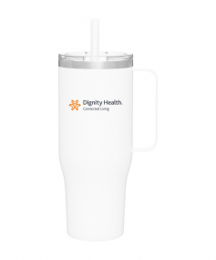 40 oz double wall 18/8 stainless steel thermal mug with copper vacuum insulation, stainless steel rim, dual-purpose push-on clear lid, matching sliding closure, flexible wide silicone straw, and powder coated finish. Individual gift box. Hand wash recommended. Do not microwave. Complies with FDA, Prop 65. 9.75" H x 4" W