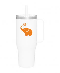 40 oz double wall 18/8 stainless steel thermal mug with copper vacuum insulation, stainless steel rim, dual-purpose push-on clear lid, matching sliding closure, flexible wide silicone straw, and powder coated finish. Individual gift box. Hand wash recommended. Do not microwave. Complies with FDA, Prop 65. 9.75" H x 4" W