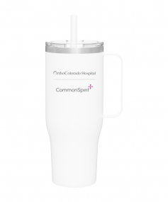 40 oz double wall 18/8 stainless steel thermal mug with copper vacuum insulation, stainless steel rim, dual-purpose push-on clear lid, matching sliding closure, flexible wide silicone straw, and powder coated finish. Individual gift box. Hand wash recommended. Do not microwave. Complies with FDA, Prop 65. 9.75" H x 4" W