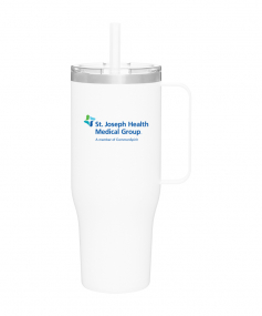 40 oz double wall 18/8 stainless steel thermal mug with copper vacuum insulation, stainless steel rim, dual-purpose push-on clear lid, matching sliding closure, flexible wide silicone straw, and powder coated finish. Individual gift box. Hand wash recommended. Do not microwave. Complies with FDA, Prop 65. 9.75" H x 4" W