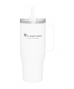 40 oz double wall 18/8 stainless steel thermal mug with copper vacuum insulation, stainless steel rim, dual-purpose push-on clear lid, matching sliding closure, flexible wide silicone straw, and powder coated finish. Individual gift box. Hand wash recommended. Do not microwave. Complies with FDA, Prop 65. 9.75" H x 4" W