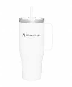 40 oz double wall 18/8 stainless steel thermal mug with copper vacuum insulation, stainless steel rim, dual-purpose push-on clear lid, matching sliding closure, flexible wide silicone straw, and powder coated finish. Individual gift box. Hand wash recommended. Do not microwave. Complies with FDA, Prop 65. 9.75" H x 4" W