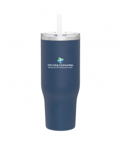 40 oz double wall 18/8 stainless steel thermal tumbler with copper vacuum insulation, stainless steel rim, dual-purpose push-on clear lid, matching sliding closure, flexible wide silicone straw, and powder coated finish