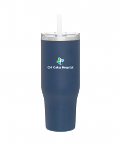 40 oz double wall 18/8 stainless steel thermal tumbler with copper vacuum insulation, stainless steel rim, dual-purpose push-on clear lid, matching sliding closure, flexible wide silicone straw, and powder coated finish