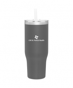 40 oz double wall 18/8 stainless steel thermal tumbler with copper vacuum insulation, stainless steel rim, dual-purpose push-on clear lid, matching sliding closure, flexible wide silicone straw, and powder coated finish