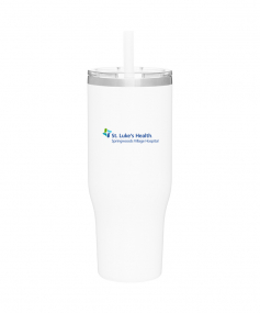 40 oz double wall 18/8 stainless steel thermal tumbler with copper vacuum insulation, stainless steel rim, dual-purpose push-on clear lid, matching sliding closure, flexible wide silicone straw, and powder coated finish