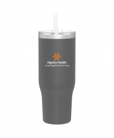 40 oz double wall 18/8 stainless steel thermal tumbler with copper vacuum insulation, stainless steel rim, dual-purpose push-on clear lid, matching sliding closure, flexible wide silicone straw, and powder coated finish