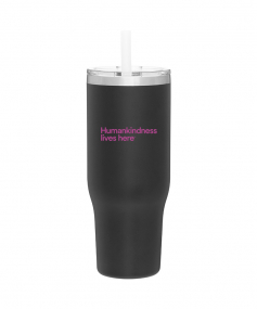 40 oz double wall 18/8 stainless steel thermal tumbler with copper vacuum insulation, stainless steel rim, dual-purpose push-on clear lid, matching sliding closure, flexible wide silicone straw, and powder coated finish