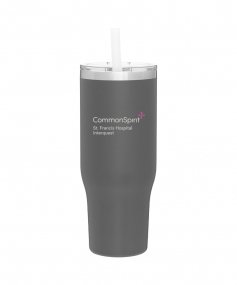 40 oz double wall 18/8 stainless steel thermal tumbler with copper vacuum insulation, stainless steel rim, dual-purpose push-on clear lid, matching sliding closure, flexible wide silicone straw, and powder coated finish