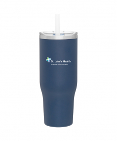 40 oz double wall 18/8 stainless steel thermal tumbler with copper vacuum insulation, stainless steel rim, dual-purpose push-on clear lid, matching sliding closure, flexible wide silicone straw, and powder coated finish