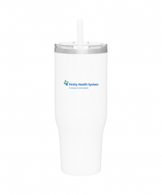 40 oz double wall 18/8 stainless steel thermal tumbler with copper vacuum insulation, stainless steel rim, dual-purpose push-on clear lid, matching sliding closure, flexible wide silicone straw, and powder coated finish