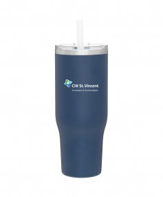 40 oz double wall 18/8 stainless steel thermal tumbler with copper vacuum insulation, stainless steel rim, dual-purpose push-on clear lid, matching sliding closure, flexible wide silicone straw, and powder coated finish