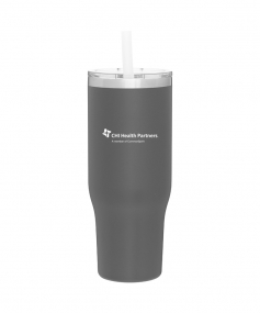 40 oz double wall 18/8 stainless steel thermal tumbler with copper vacuum insulation, stainless steel rim, dual-purpose push-on clear lid, matching sliding closure, flexible wide silicone straw, and powder coated finish