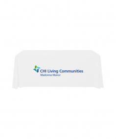 6' Standard PolyPoplin Throw style table cover with one color logo. Designed for quick and easy use while looking great. All corners are rounded meaning they will not gather and lay on the floor. Floor length on all 4 sides. Made from woven polyester. 72" L x 30" D x 29" H
