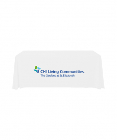 6' Standard PolyPoplin Throw style table cover with one color logo. Designed for quick and easy use while looking great. All corners are rounded meaning they will not gather and lay on the floor. Floor length on all 4 sides. Made from woven polyester. 72" L x 30" D x 29" H