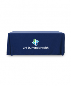 6' Standard PolyPoplin Throw style table cover with one color logo. Designed for quick and easy use while looking great. All corners are rounded meaning they will not gather and lay on the floor. Floor length on all 4 sides. Made from woven polyester. 72" L x 30" D x 29" H