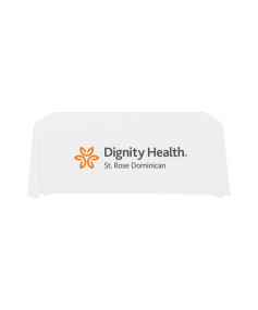 6' Standard PolyPoplin Throw style table cover with one color logo. Designed for quick and easy use while looking great. All corners are rounded meaning they will not gather and lay on the floor. Floor length on all 4 sides. Made from woven polyester. 72" L x 30" D x 29" H