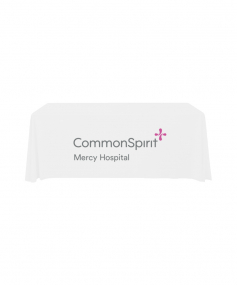 6' Standard PolyPoplin Throw style table cover with one color logo. Designed for quick and easy use while looking great. All corners are rounded meaning they will not gather and lay on the floor. Floor length on all 4 sides. Made from woven polyester. 72" L x 30" D x 29" H