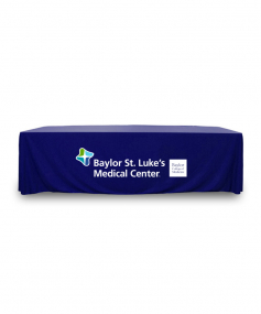 8 ft. Premium PolyKnit throw table cover with one color logo. Fits a 96 inch wide x 30 inch deep table. All corners are rounded meaning they will not gather and lay on the floor. Floor length on 4 sides. This cloth requires no ironing, is EasyCare machine washable and dryer safe.