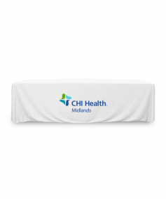 8 ft. Premium PolyKnit throw table cover with one color logo. Fits a 96 inch wide x 30 inch deep table. All corners are rounded meaning they will not gather and lay on the floor. Floor length on 4 sides. This cloth requires no ironing, is EasyCare machine washable and dryer safe.