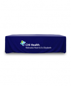 8 ft. Premium PolyKnit throw table cover with one color logo. Fits a 96 inch wide x 30 inch deep table. All corners are rounded meaning they will not gather and lay on the floor. Floor length on 4 sides. This cloth requires no ironing, is EasyCare machine washable and dryer safe.