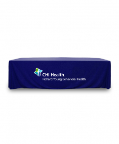 8 ft. Premium PolyKnit throw table cover with one color logo. Fits a 96 inch wide x 30 inch deep table. All corners are rounded meaning they will not gather and lay on the floor. Floor length on 4 sides. This cloth requires no ironing, is EasyCare machine washable and dryer safe.