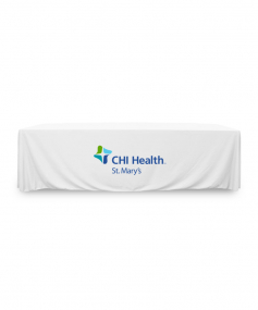 8 ft. Premium PolyKnit throw table cover with one color logo. Fits a 96 inch wide x 30 inch deep table. All corners are rounded meaning they will not gather and lay on the floor. Floor length on 4 sides. This cloth requires no ironing, is EasyCare machine washable and dryer safe.