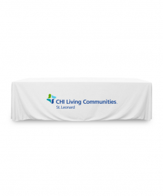 8 ft. Premium PolyKnit throw table cover with one color logo. Fits a 96 inch wide x 30 inch deep table. All corners are rounded meaning they will not gather and lay on the floor. Floor length on 4 sides. This cloth requires no ironing, is EasyCare machine washable and dryer safe.