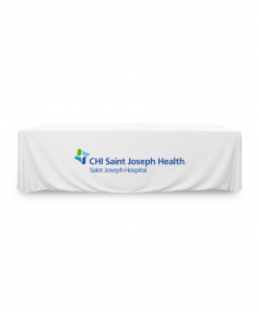 8 ft. Premium PolyKnit throw table cover with one color logo. Fits a 96 inch wide x 30 inch deep table. All corners are rounded meaning they will not gather and lay on the floor. Floor length on 4 sides. This cloth requires no ironing, is EasyCare machine washable and dryer safe.